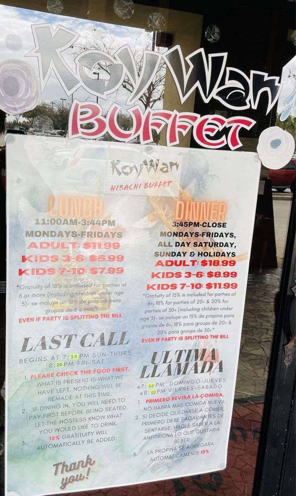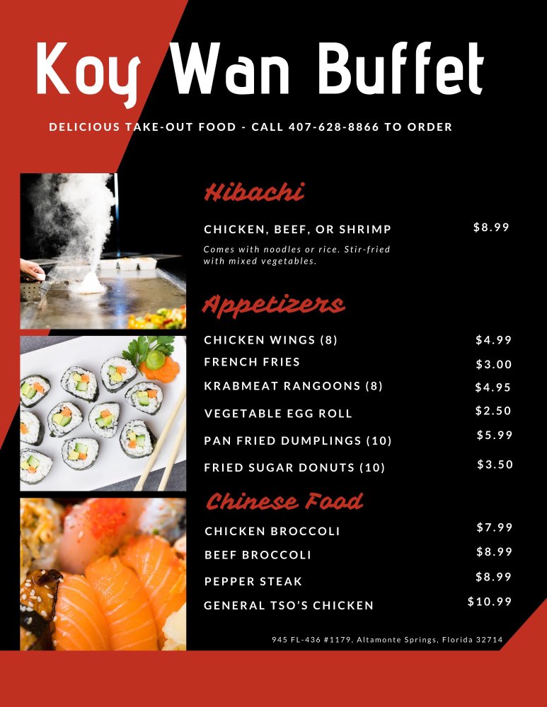 Introducing the menu at Koywan Hibachi Buffet, a Chinese and Japanese buffet in Altamonte Springs, FL. With a wide variety of options ranging from hibachi dishes like Chicken, Beef, and Shrimp Hibachi to delicious appetizers like Chicken Wings, Vegetable Egg Rolls, and Pan-Fried Dumplings, there is something for everyone. The Chinese food section offers classic dishes like Chicken Broccoli, Beef Broccoli, and General Tso's Chicken. Customers rave about the fresh sushi selection and the teppanyaki dining experience provided by the skilled chefs. The restaurant's ambiance, service, and food quality receive high praise from patrons, making it a must-visit for anyone craving Asian cuisine. With reasonable prices and a convenient location, Koywan Hibachi Buffet is the go-to spot for those looking for a diverse and satisfying buffet experience.